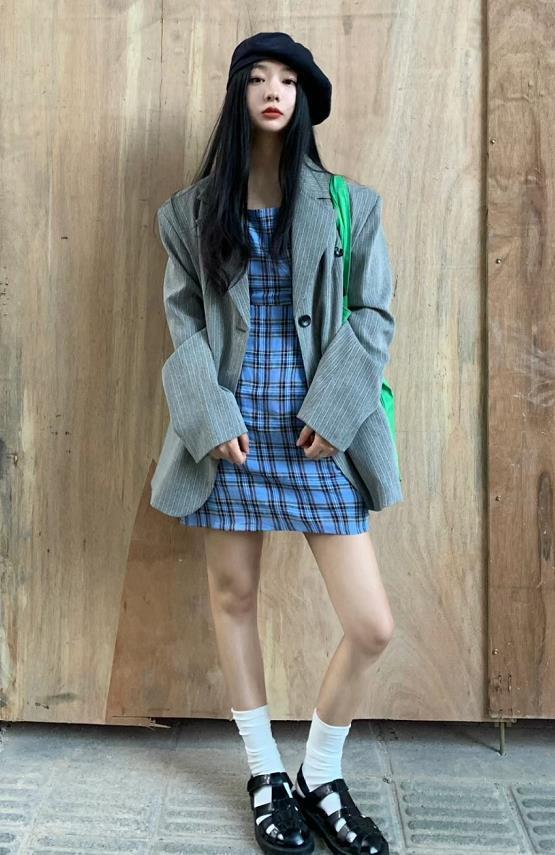 格子西裝外套+短裙和樂福鞋,氣質又不失幹練利落。