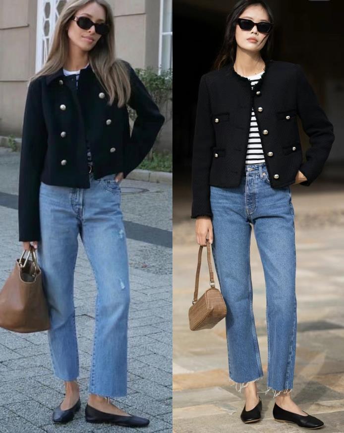 黑色小香風外套穿起來也太氣質了,利落的短款,上身後簡直輕鬆拉長下身的比例,在視覺上呈現出高挑感。搭配起九分牛仔褲,更是多了幾分利落。