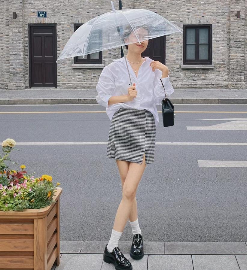 白襯衫和樂福鞋真的很配哦,像白襯衫這種基礎款上衣,百搭又簡約大方,下身配的格子半身短裙,再提高腰線後,下身的比例瞬間就被拉長了。