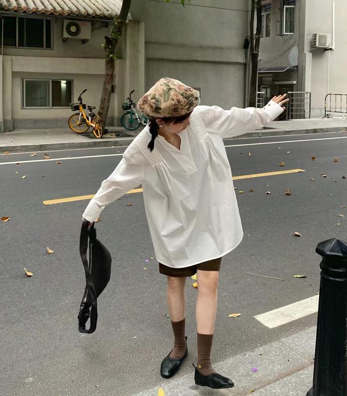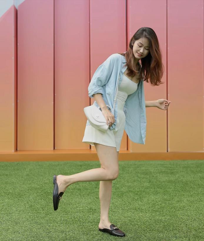 白色寬鬆襯衫+短褲+奶奶鞋,小個子女生就可以這麼穿哦。