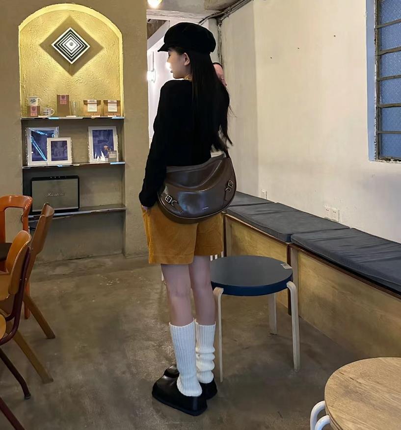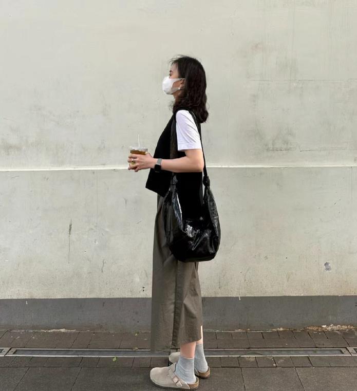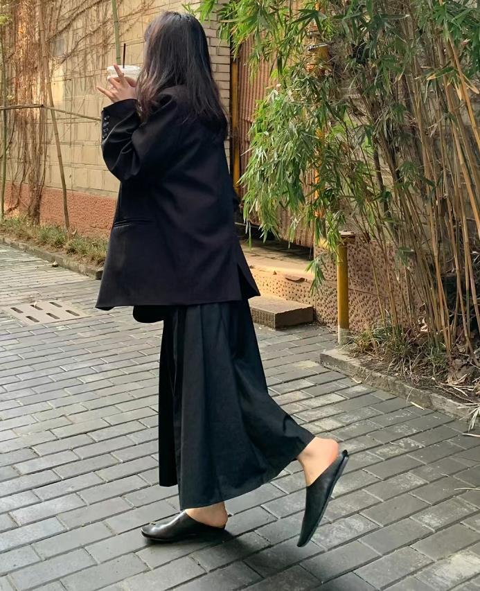 這款黑色穆勒鞋也太好穿啦,搭配白色堆堆襪超有氛圍感的,黑白配色組合時髦簡約又大方。上身選擇一件與鞋子同色的衣服,就增加造型和諧度了。