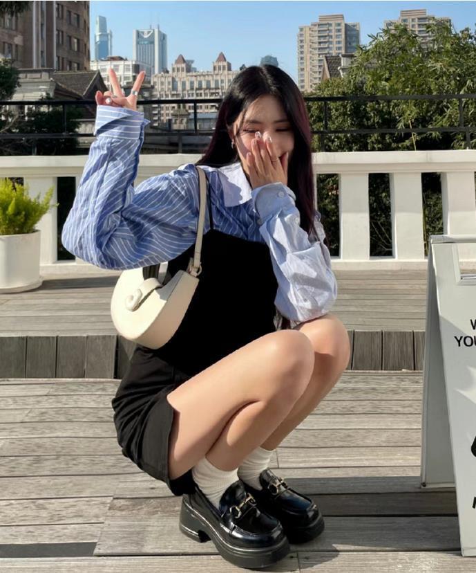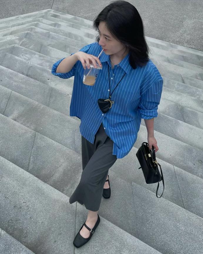 這套韓劇歐尼風穿搭,簡直被美到了,藍黑的配色組合,清爽又帶着幾分高級,黑色厚底樂福鞋的加入,又爲整個着裝增添了氣質。