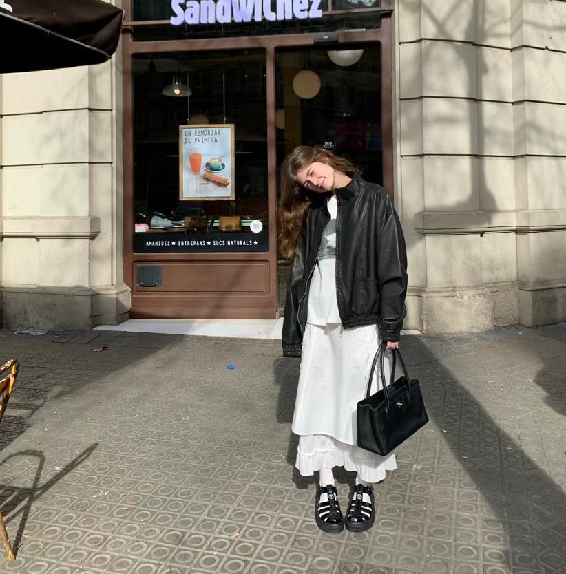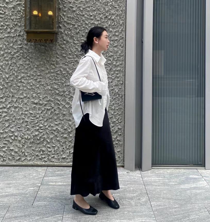 黑白配的簡單穿搭,這兩種顏色組合在一起,可是超顯高級時髦的,白色寬鬆襯衫和黑色半身長裙,上下都是寬鬆的版型,給人一種鬆弛隨性的範。