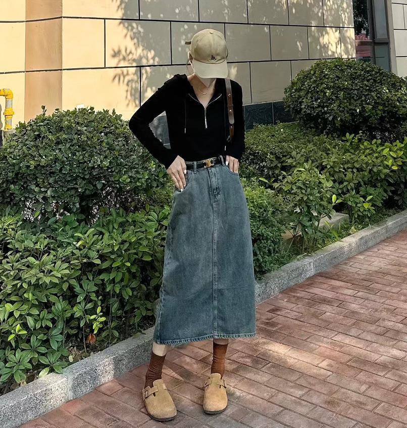 黑色針織長袖,帶點修身的版型,穿起來超級顯瘦的,下身是一條黑色牛仔半身長裙,巨遮胯顯瘦的。