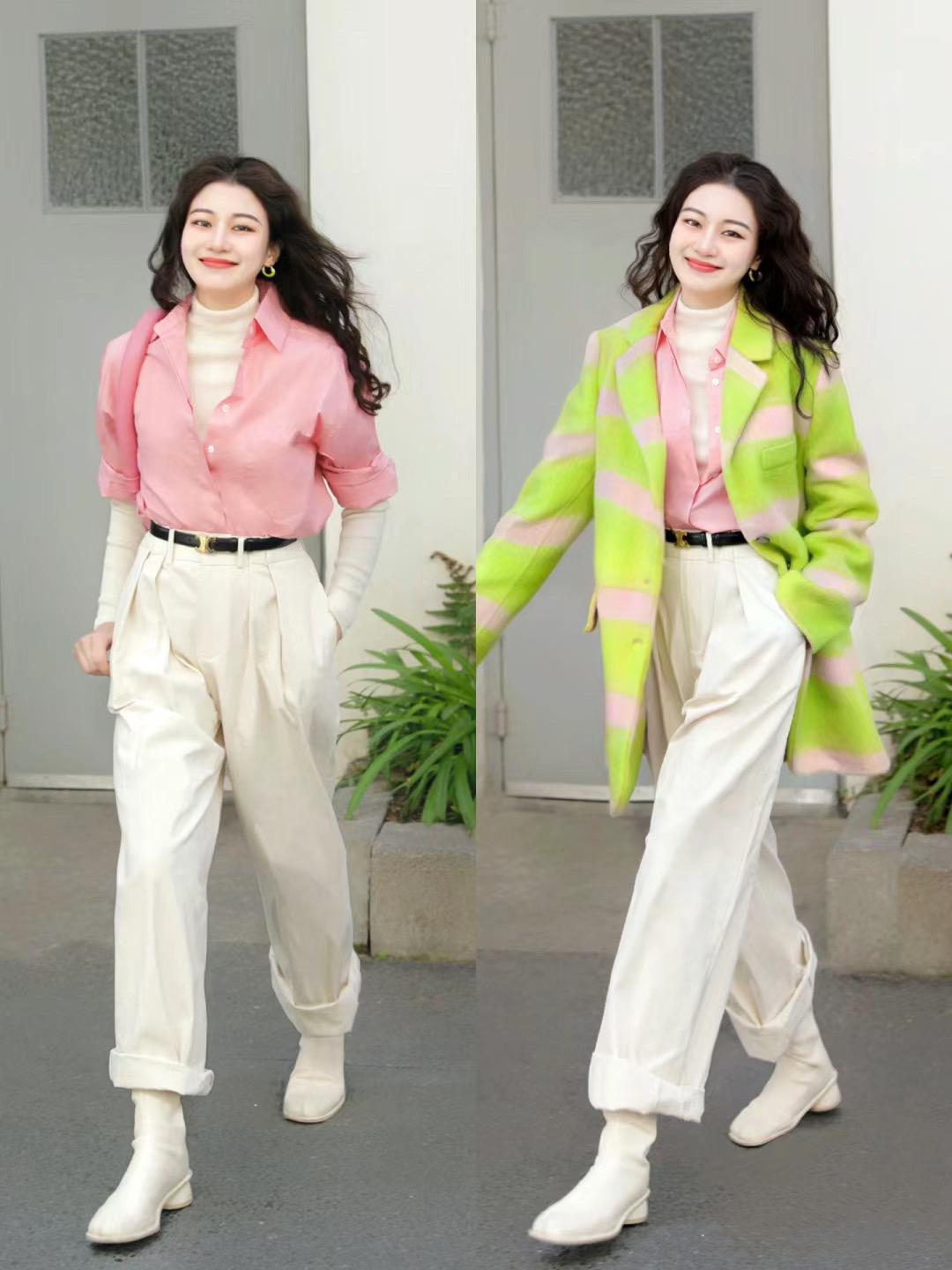 現在的你,更懂得如何揚長避短。條紋襯衫疊搭白色T恤,配白色直筒褲勾勒出高腰線,搭配黑色方頭短靴利落又幹練,具備了女強人的高級美。