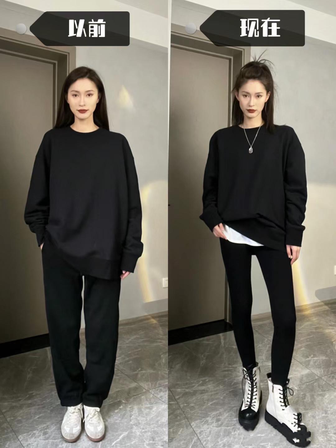 以前的你,穿寬鬆的黑色衛衣,搭配同色系黑色褲子,雖然整體中規中矩,卻也少了時尚的個性。如果是體型微胖的話,就很容易顯得臃腫。