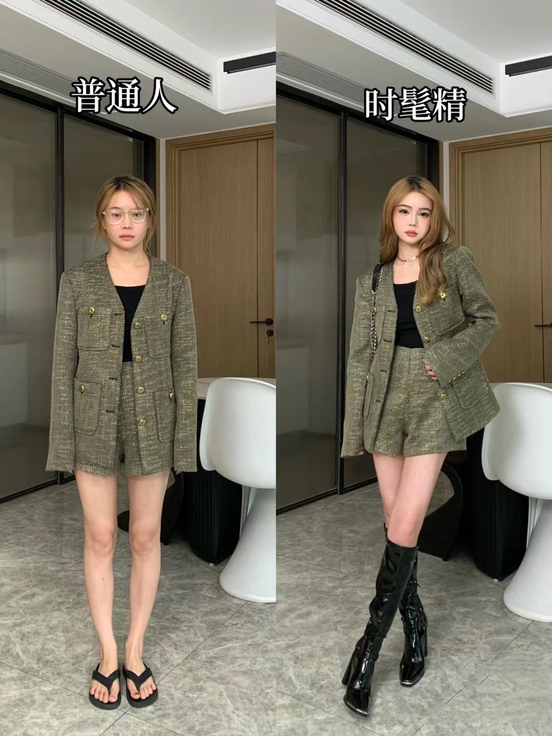 同樣是一件小香風套裙,不同的搭配也演繹着不一樣的氣質美。在沒有化妝的前提下,整個人的神態氣質都有一點土氣,化妝後明顯洋氣了很多。