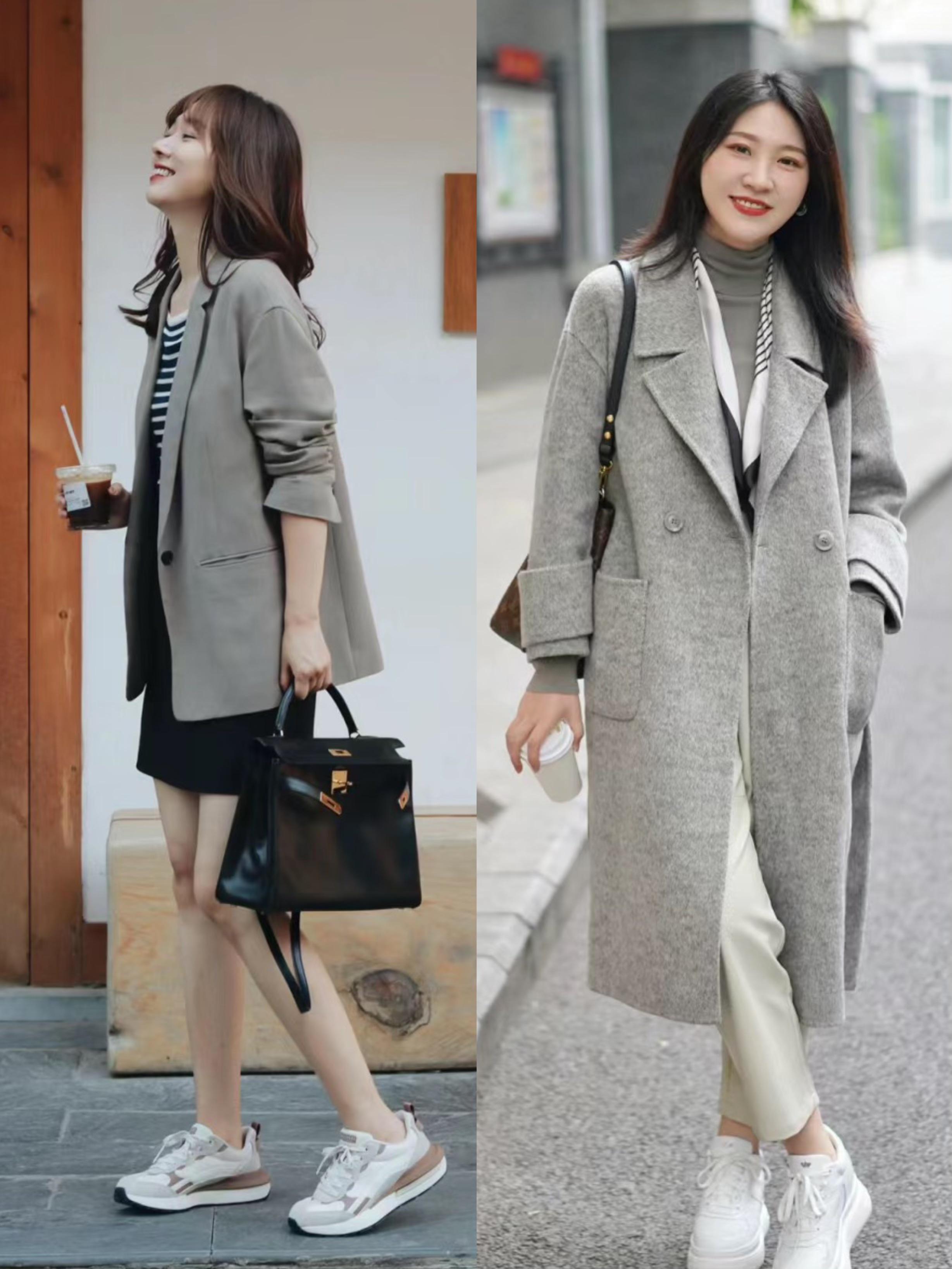 厚底的小白鞋,有一種運動風的美感。這種線條流暢的厚底小白鞋,選擇了灰白撞色的設計,也更多了活力美。搭配寬鬆的西服外套,可以更自然的弱化年齡感。