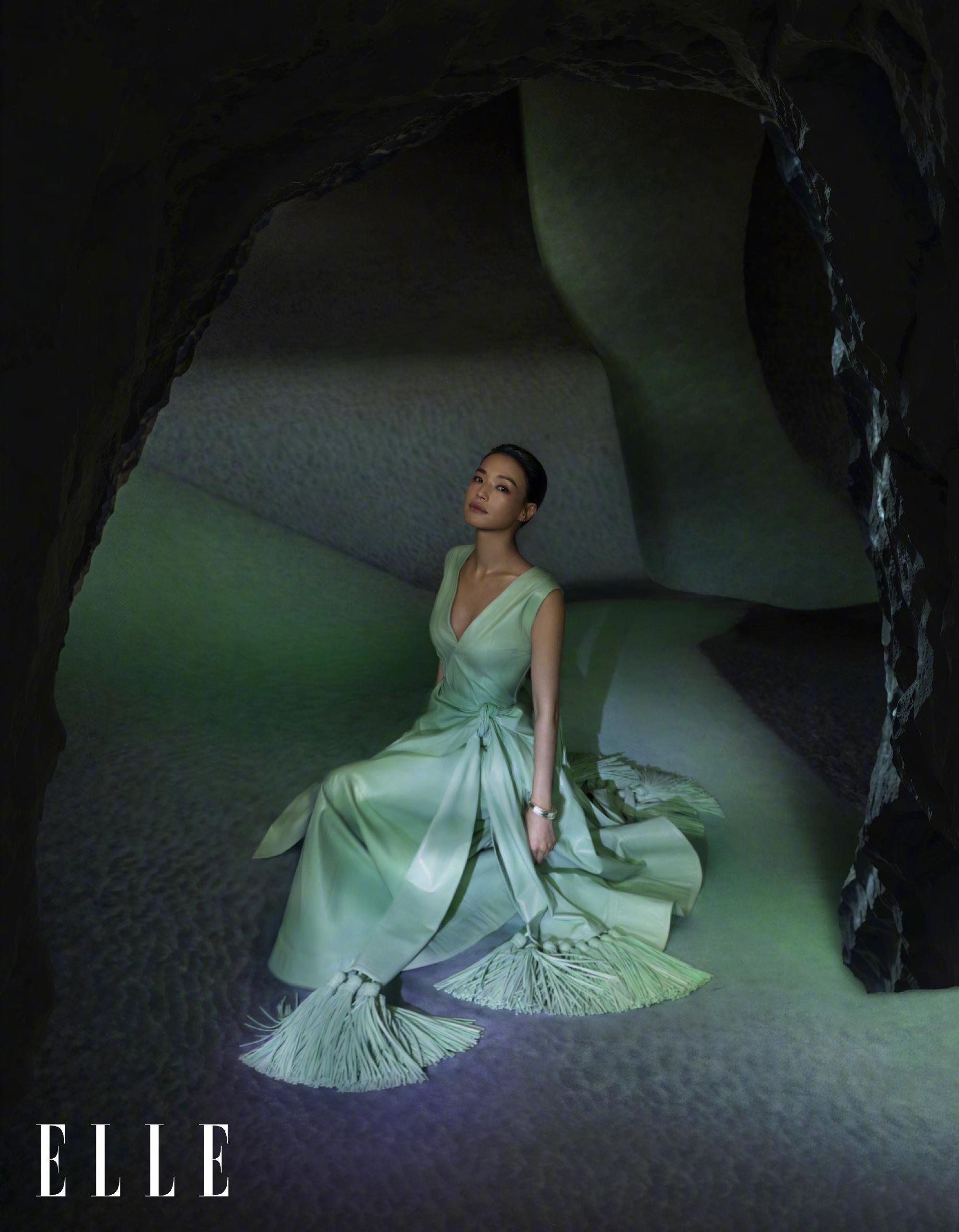蹲坐在地上,45度上揚的眉眼,更多了幾分冷冽與清冷。也只有這樣的姿態,纔可以看得出這條綠色長裙的細節設計。蝴蝶結的下襬,是流蘇的點綴,浪漫又迷人。