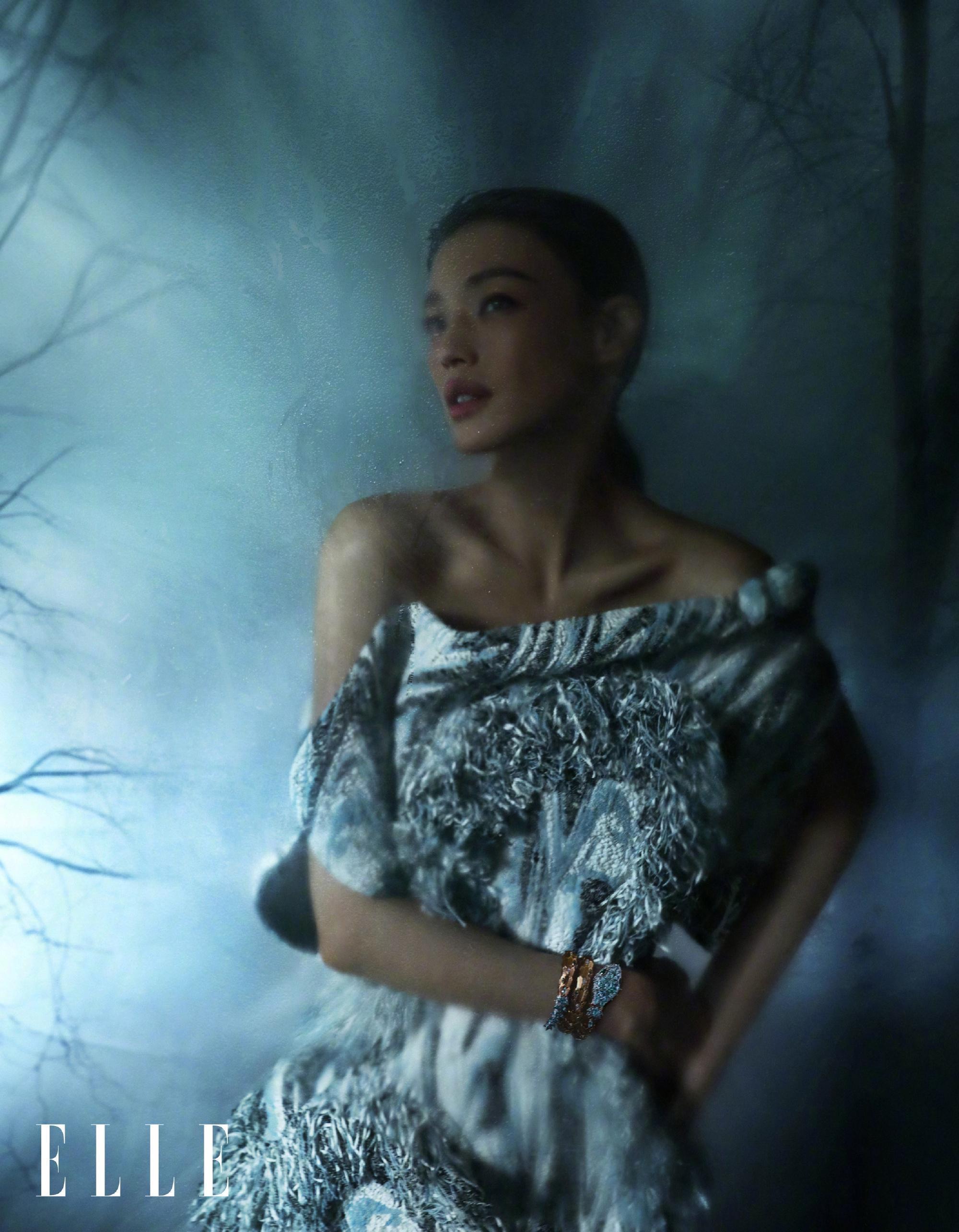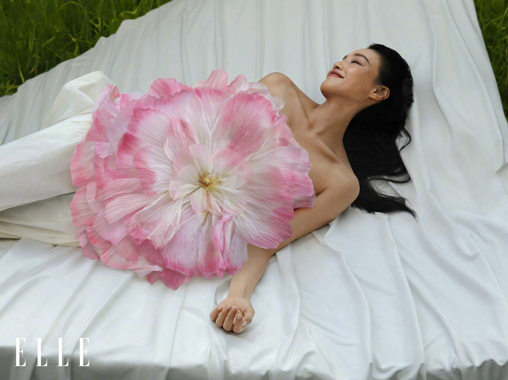 在舒淇的這一期時尚雜誌中,最惹眼的就數這一身桃花裝了。用粉嫩的桃花花朵掩蓋上半身,露出優越的直角肩、天鵝頸。