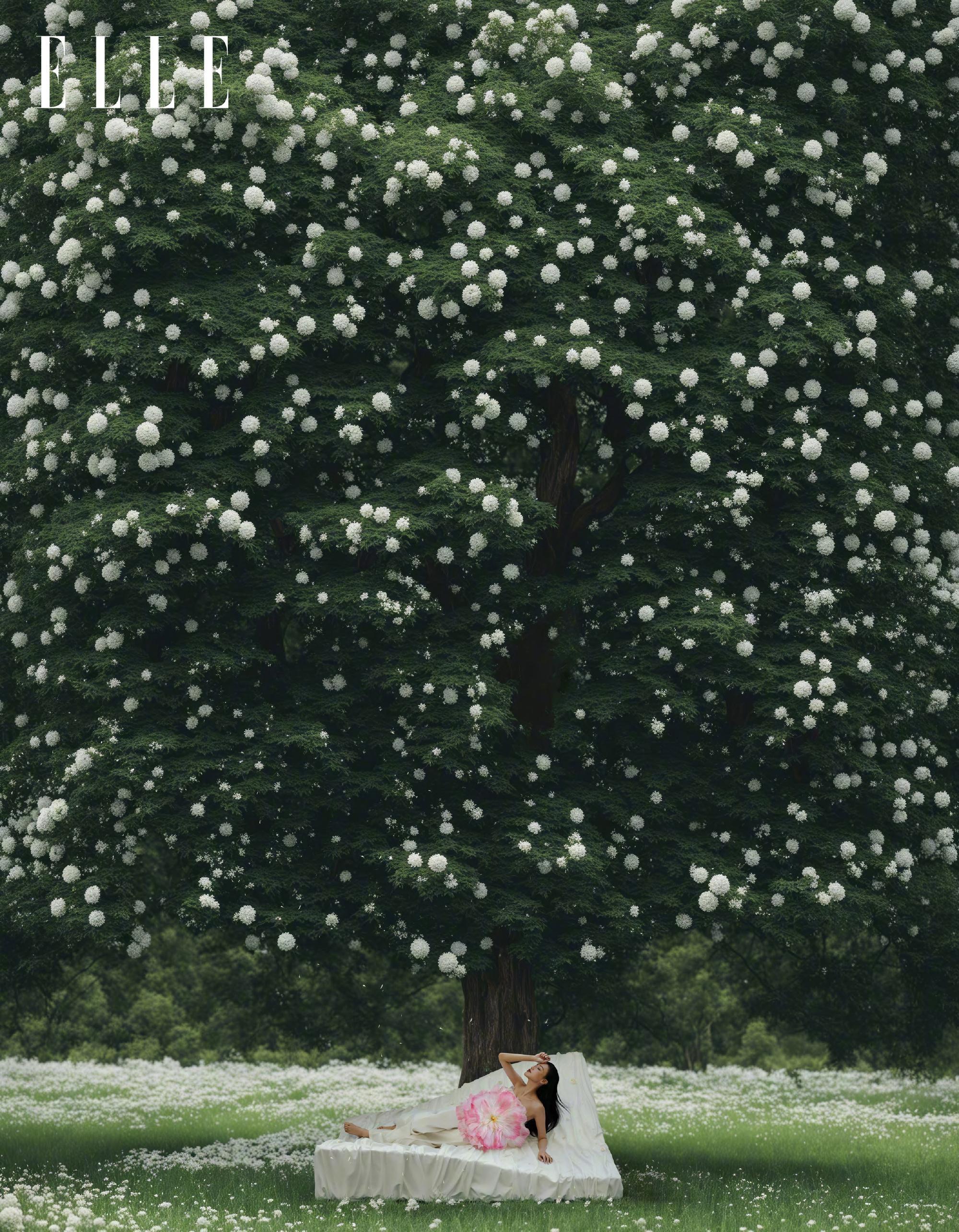 舒淇就這樣側臉躺在白色幕布上,黑色的長髮勾勒出更立體的臉型。整個人身上散發着一種鬆弛美,白色桃花作爲上衣,既浪漫又性感,配上白色長褲、也是清新唯美。