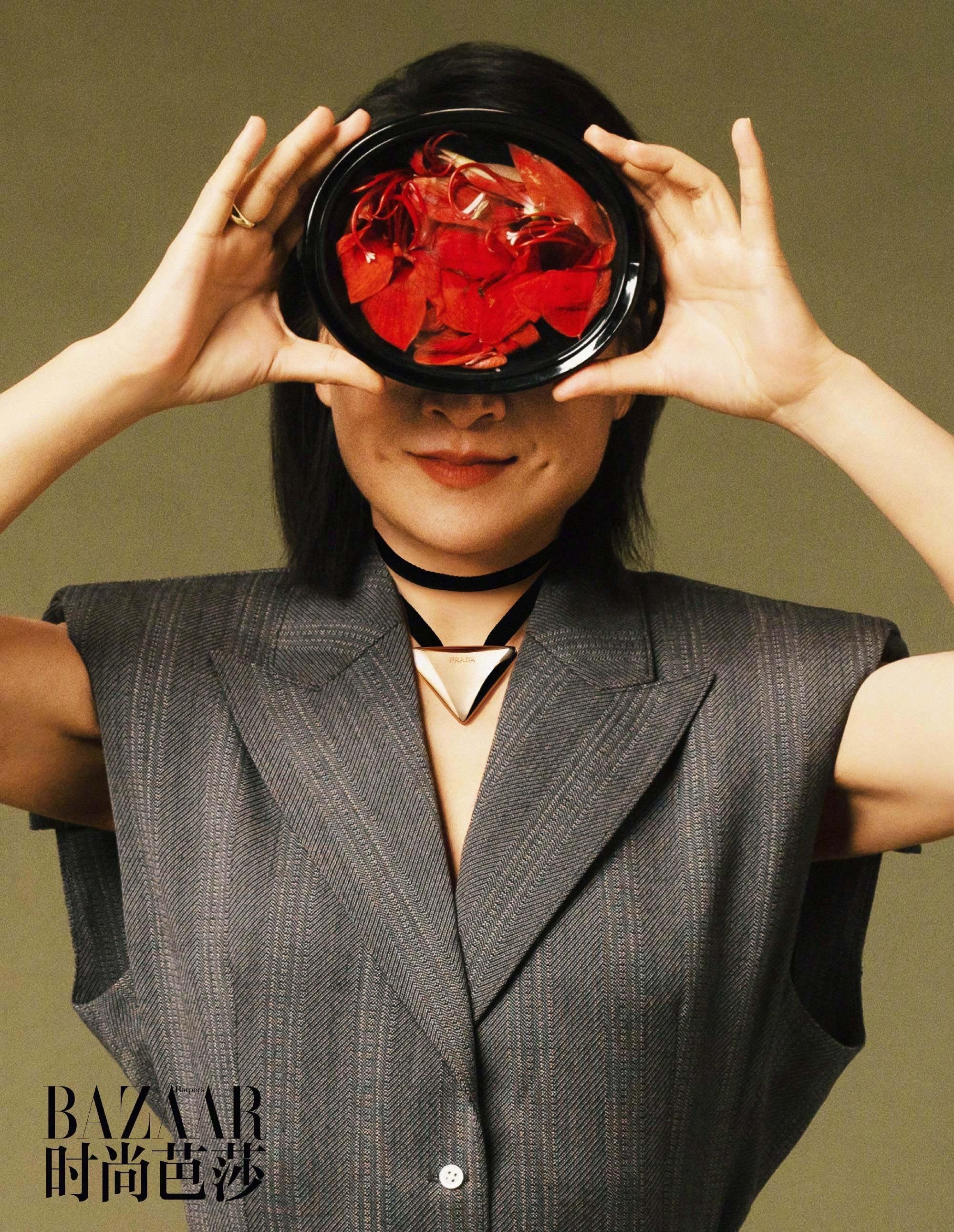 西裝馬甲,依然是小廓形的剪裁,顯得她身板更加輕盈。擋住了雙眼,也更多了意境美,深深的酒窩,讓人迷醉。