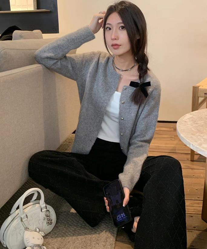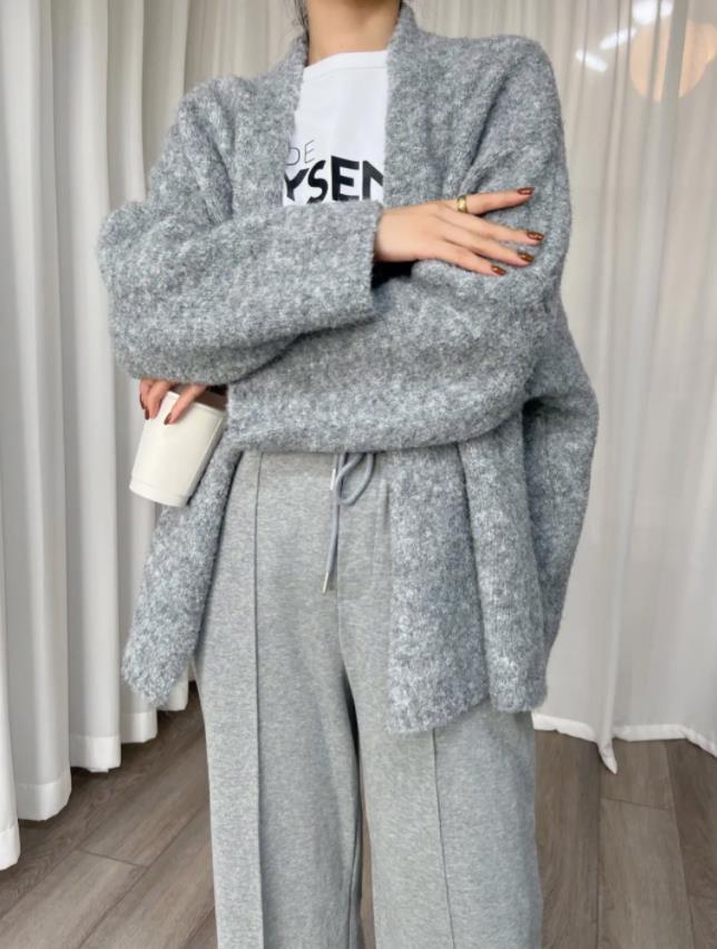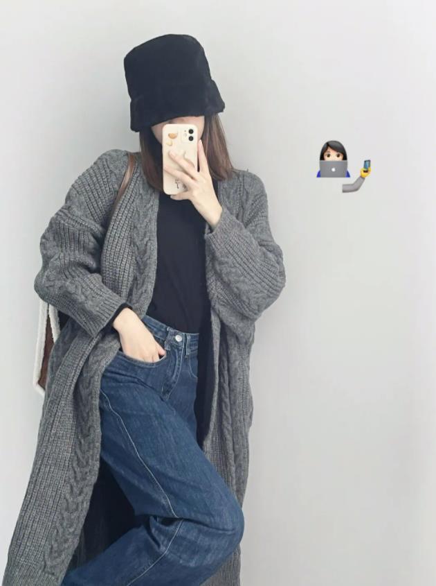 春天就是少不了針織開衫啊,這種高級灰色,好顯白啊,柔軟舒適的材質,哪怕貼身穿也不怕。選擇黑色長褲,視覺上雙腿襯得很纖細修長。
