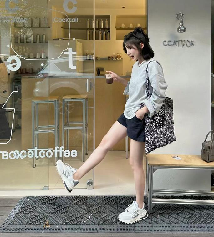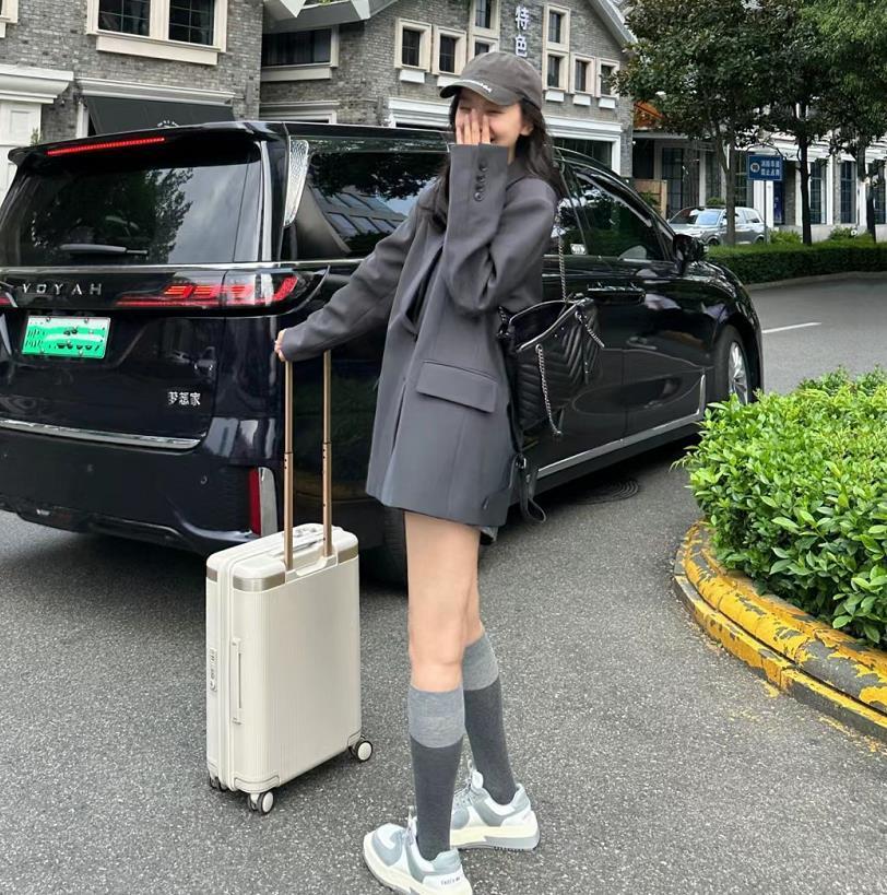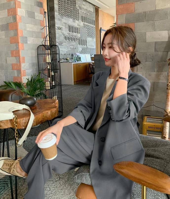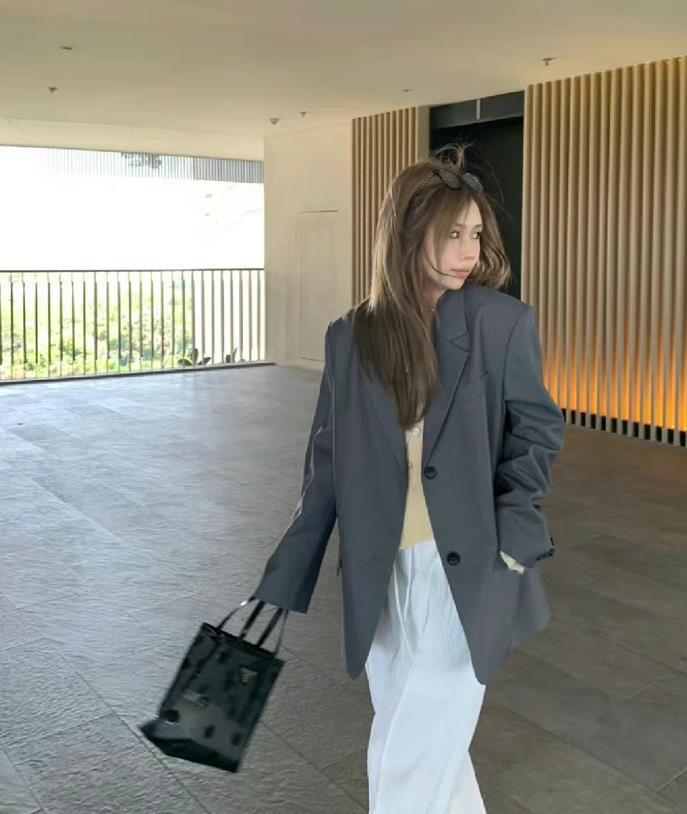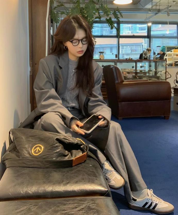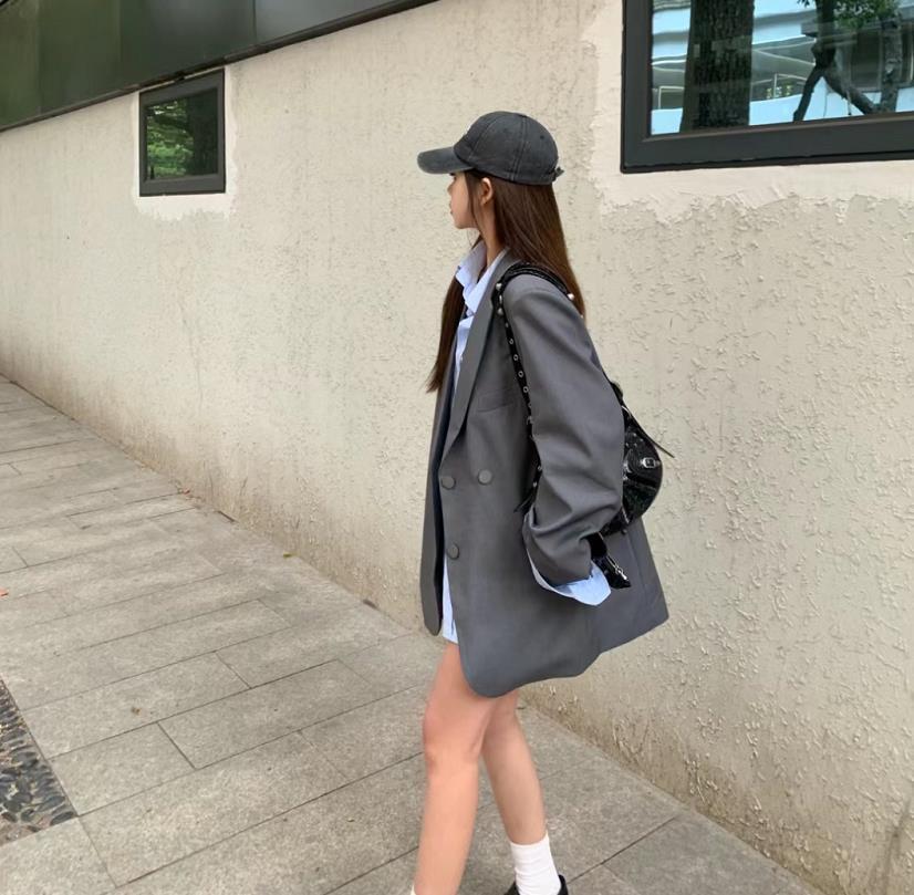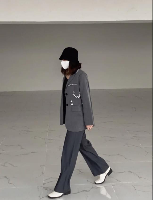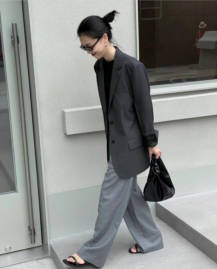 灰西裝好有質感啊,整個穿搭風格有億點點韓,寬鬆的版型,穿得更休閒舒適,腳上的中筒襪子也是灰色的,巧妙與西裝進行了呼應。