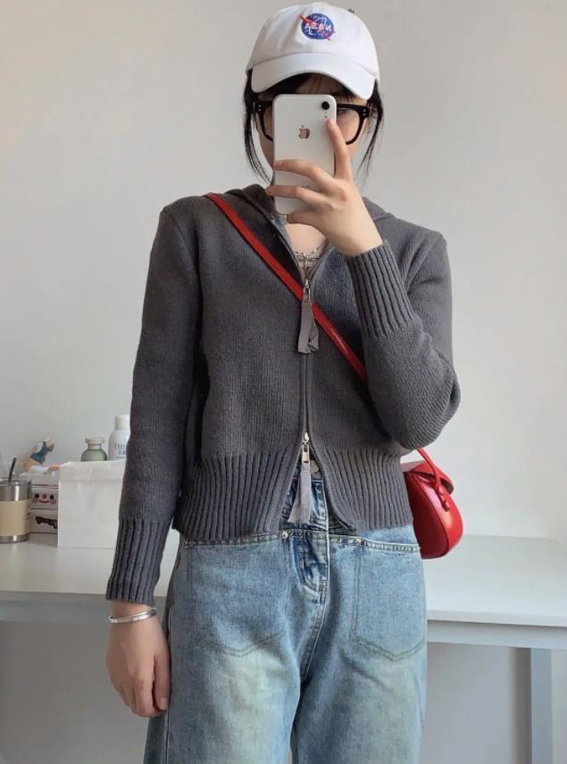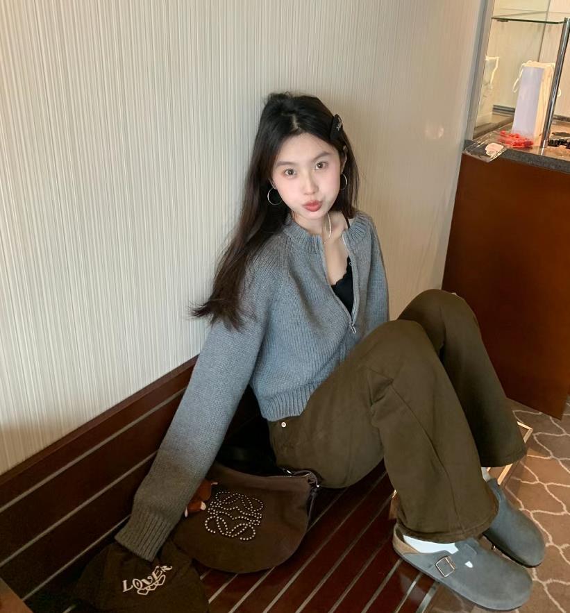 灰棕的配色天生一對,純色系真的百搭不過時,短款的灰色針織開衫,專屬於小個子女生的。腳下踩着的灰色勃肯鞋,很好與之進行了呼應,和諧極了。