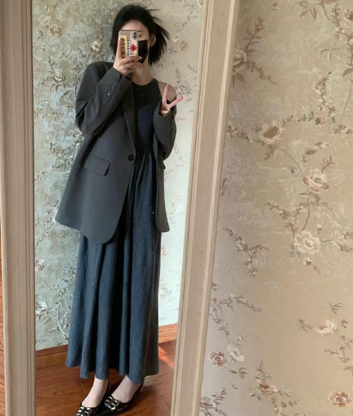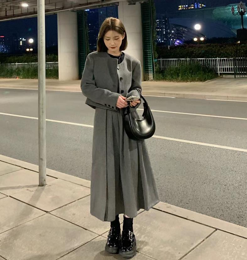 灰色系穿搭是最高級的啦,今年早春穿灰色西裝外套真不錯,搭配同時的百褶半身長裙,優雅又不失氣質。大姐姐風輕熟範,好好看。