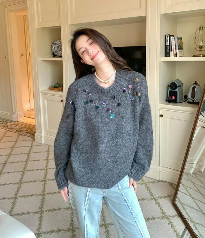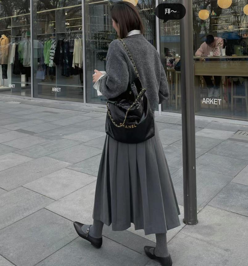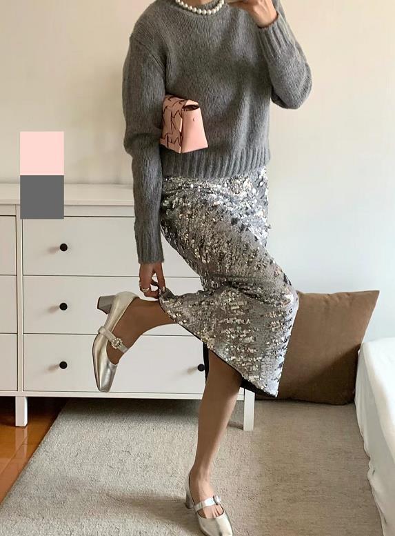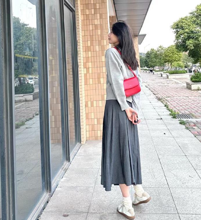 灰色毛衣+百褶裙,很適合早春的疊穿,一身灰色,將格雷系的風格很好演繹出來。早春溫度有些冷,建議上身疊穿一件打底或白襯衫,這樣就很顯層次了。