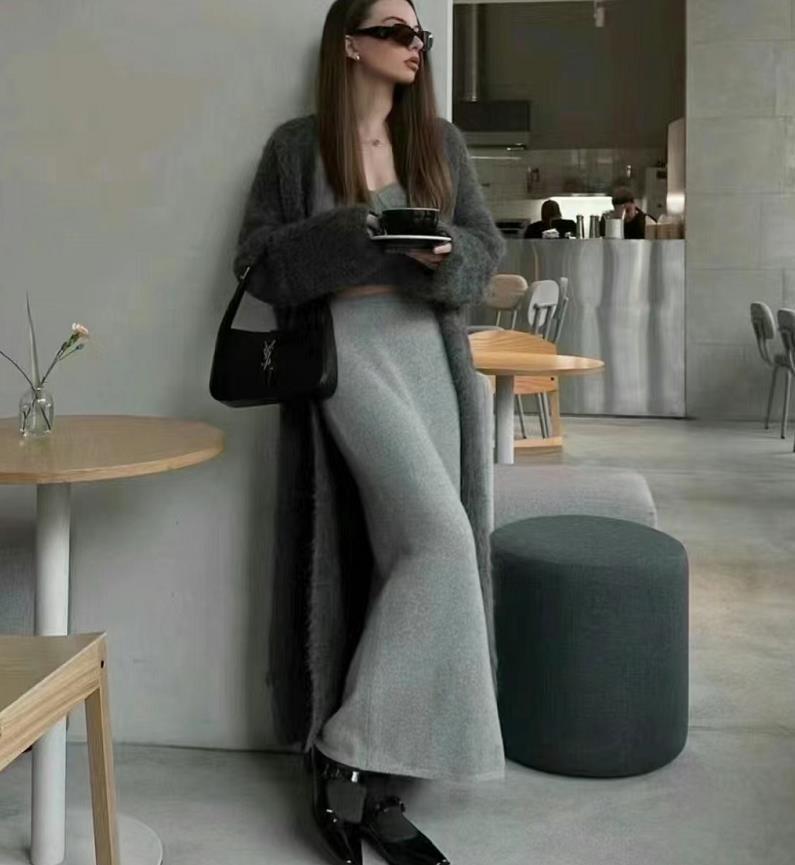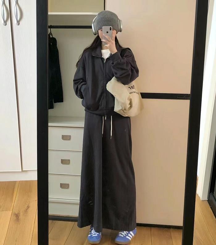 深灰套裝裙,格雷系風滿滿的,衛衣+半裙,太愛這種休閒風拉,上下的版型都是寬鬆的,日常簡約又大氣。