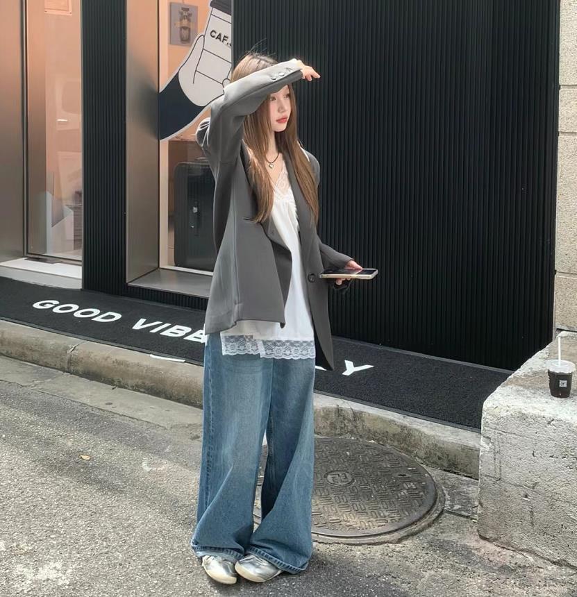 又到了西裝的季節了,穿不膩的灰色,百搭不說,還顯得很高級,白色蕾絲上衣+牛仔闊腿拖地褲,隨性慵懶。