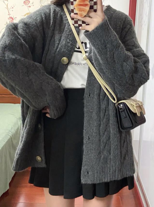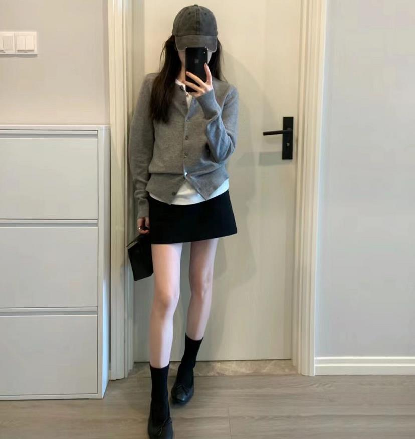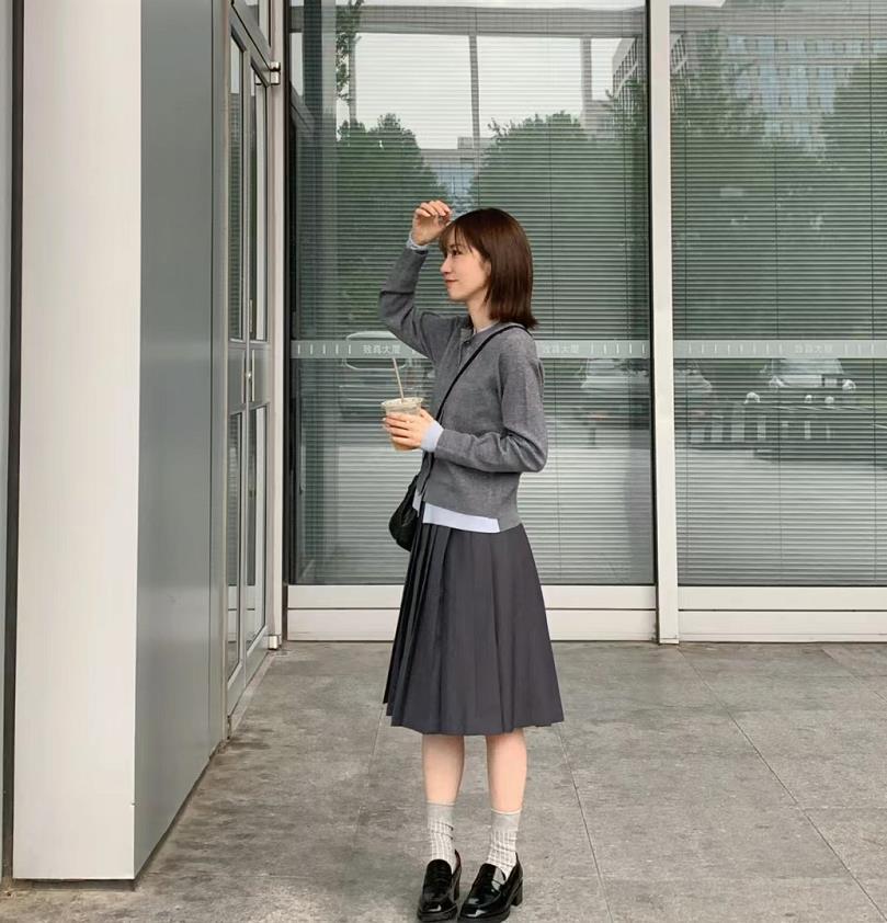 灰色系的穿搭,簡簡單單比較耐看,針織開衫+白t疊穿,顯層次又保證一定的穿着溫度。剛好過膝的百褶半裙,對於個矮的姐妹也很友好。