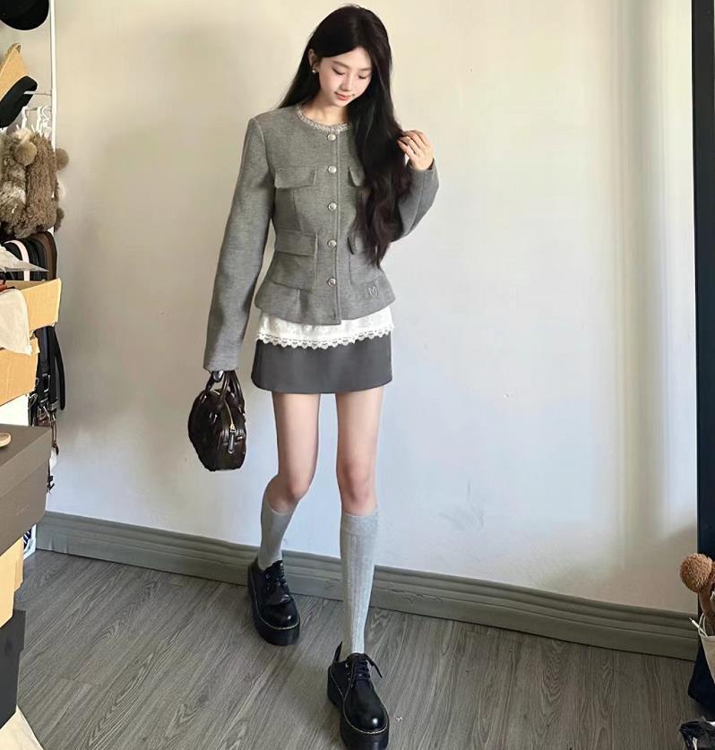 今天是格雷系女孩哦,千金風穿搭,全身上下都給人甜美和氣質,腳上利用一雙中筒襪來點綴,增加造型細節,又不失層次。