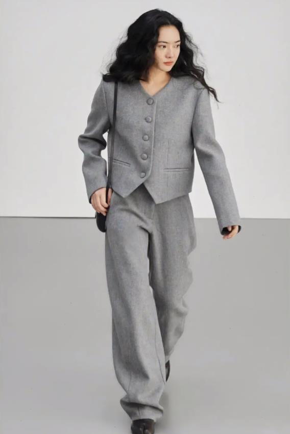 灰色通勤休閒的三件套裝,軟糯的面料,穿起來超級舒服的,慵懶隨意,不管是通勤還是出門遊玩都ok。