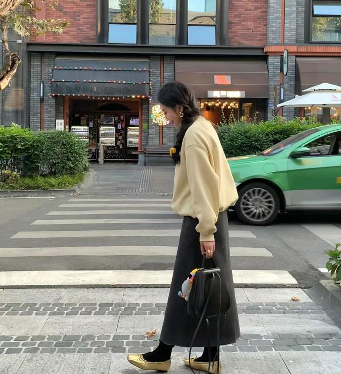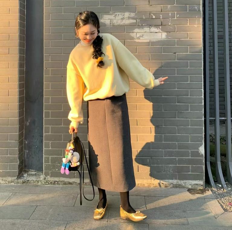 裏面疊穿件白色打底吧,保暖又時髦,下身選一條深灰色半裙,舒適極了。