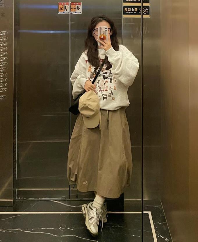 黑色衛衣+杏色抽繩半裙,在春天就是要這麼穿啊,鞋子選擇一雙運動鞋來配吧,可休閒舒適自在了。