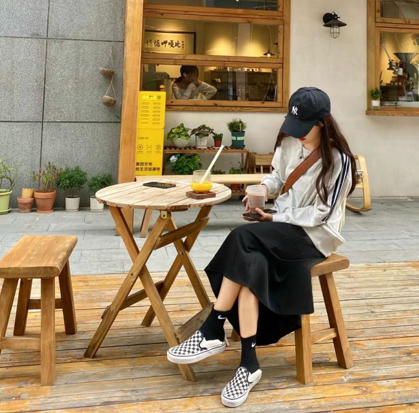 搭配黑色半身長裙,腳上黑色襪子和板鞋,外露出來的襪子,增加層次又時髦。