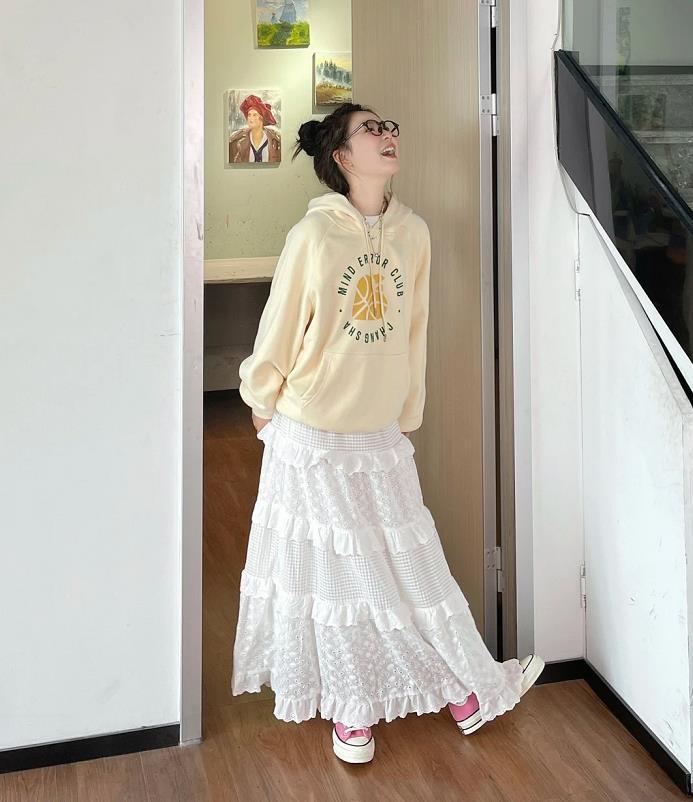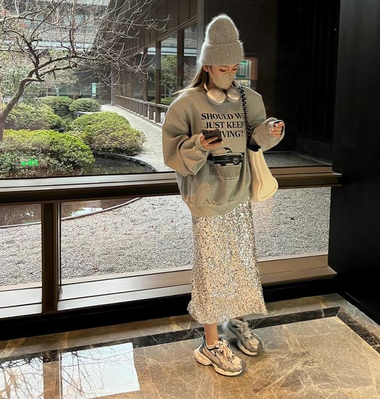 衛衣與半裙的組合,就是高顏值的一對,裙子的浪漫能夠平衡衛衣帶來的休閒隨性。不管是潮人博主,還是明星街拍們,都在穿,毫不費力就展現出時髦。