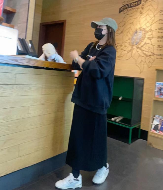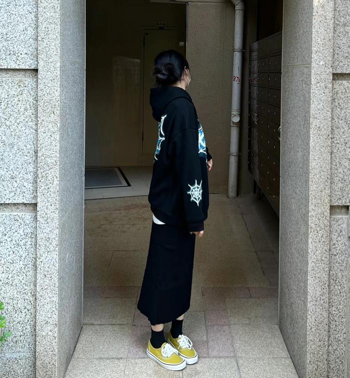我就愛這一身黑,黑色寬鬆衛衣+同色半身裙,同色系的組合,不僅顯高級還時髦,記得在衛衣裏面加一件白t,豐富整個穿搭又不失層次,春天很合適的搭配。