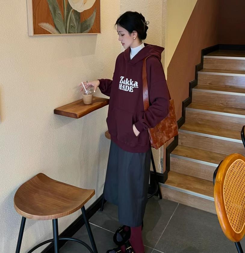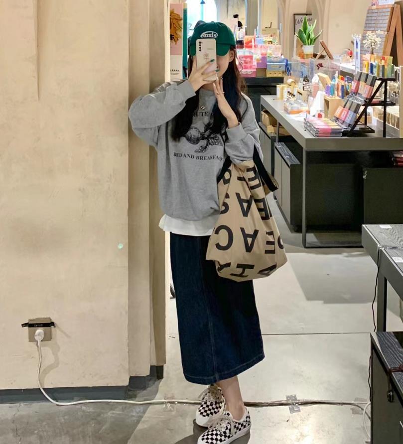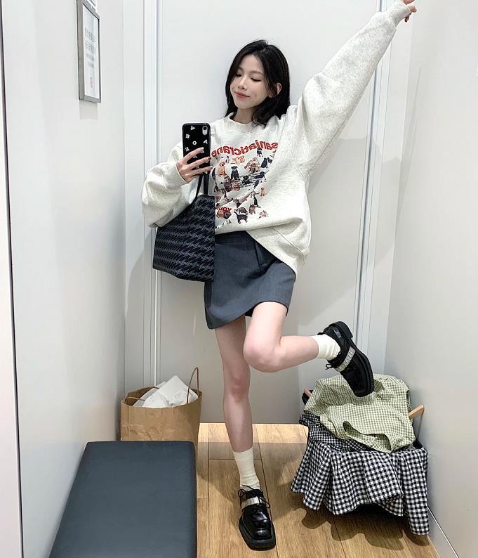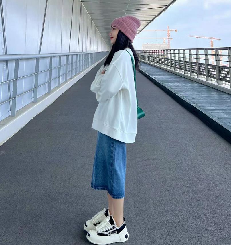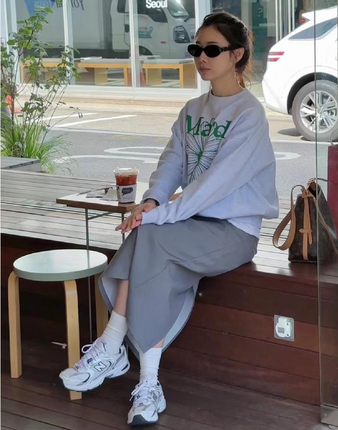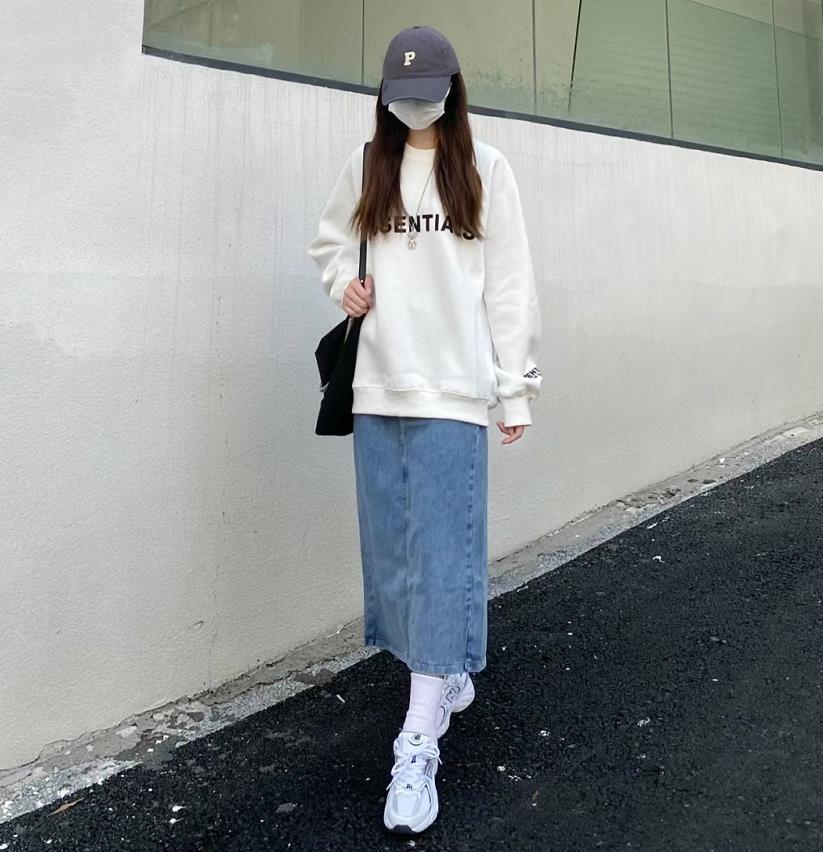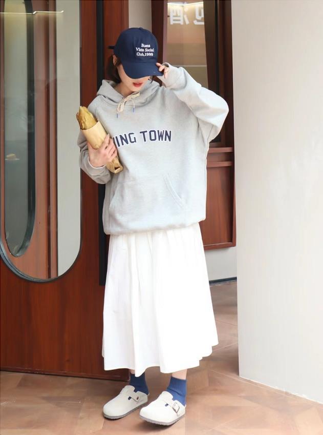 灰衛衣和牛仔半裙真的很chill哦,這件衛衣穿上身裏面就有了ins博主的那味了,疊穿白t增加層次感。