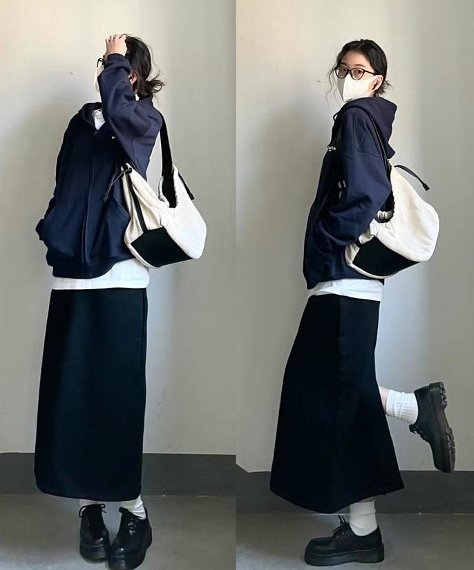 衛衣配半裙,春日氛圍感妥妥拿捏了,黑色衛衣+白色t恤,疊穿的組合實在是太顯層次了,記得要稍微露出裏面的內搭。