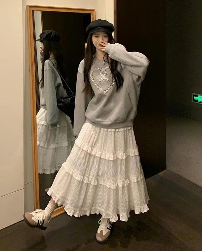 韓系少女風的穿搭,這一套我也太喜歡了,亮片愛心衛衣疊穿蕾絲半裙,將少女風演繹得淋漓盡致。