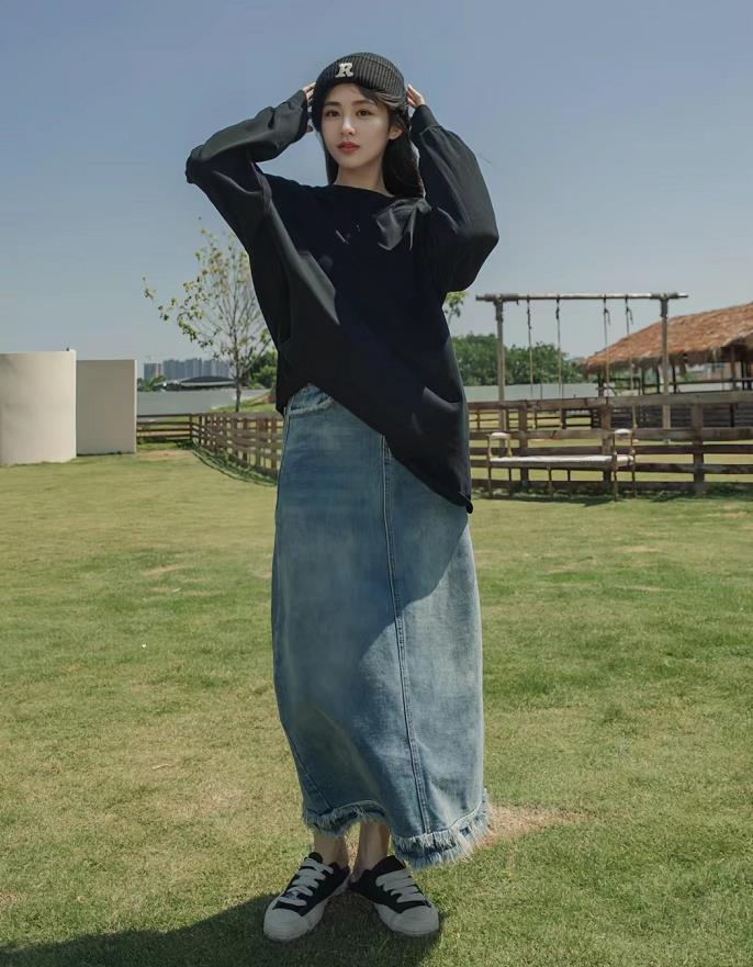誰懂啊,黑色真的又酷又溫柔,黑色衛衣搭配牛仔半裙,沒有想到這一套組合起來這麼好看,整套上身遮肉又顯瘦,簡直是我的菜。