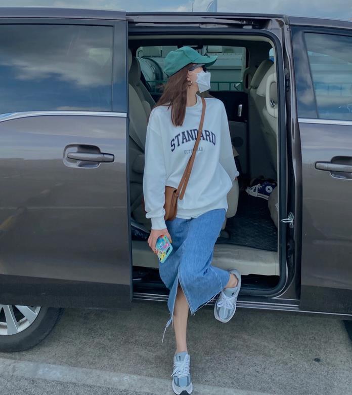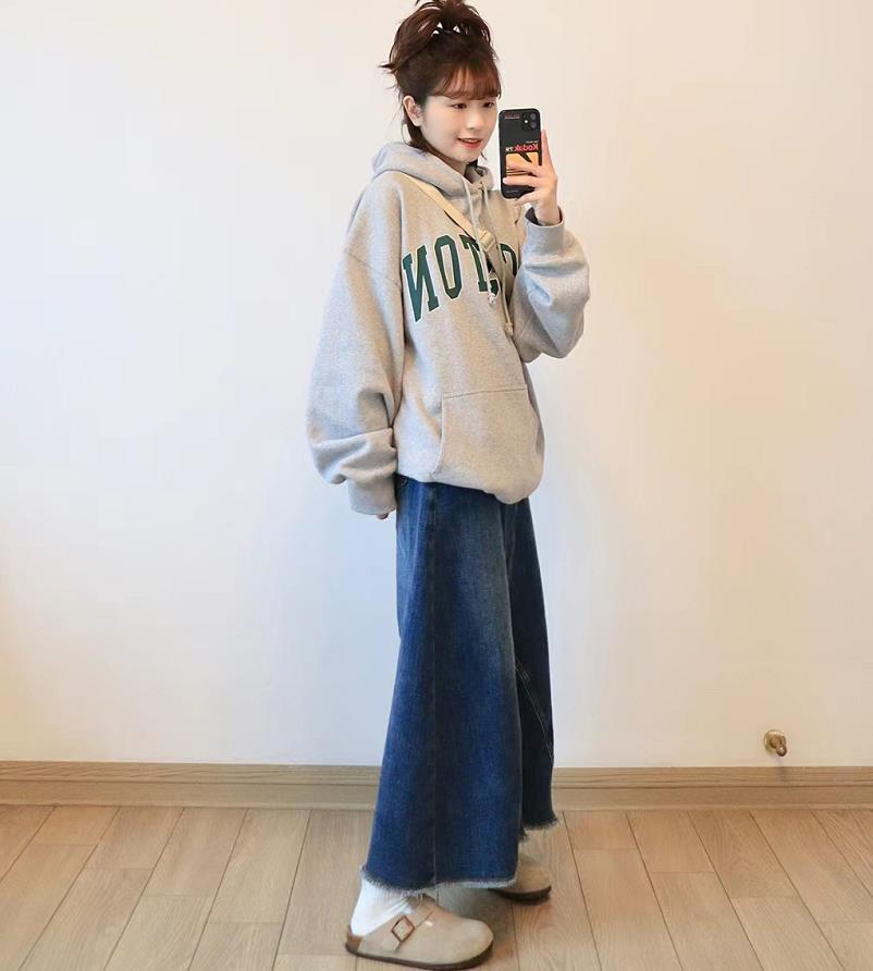 衛衣牛仔裙可太舒服了,灰色連帽衛衣真的怎麼穿都不會出錯,搭配做舊的毛邊牛仔裙,一整個韓裏韓氣的,舒服又隨性。