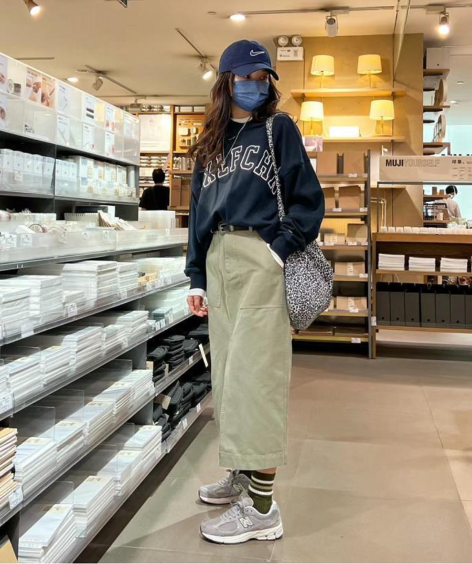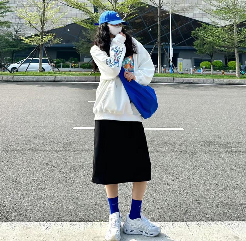 好愛這種不費力的韓系慵懶感穿搭,衛衣+工裝半裙,外加一個不帶走,一整個韓系休閒風。藏藍色的衛衣,很好搭配也不挑人,鞋子是今年流行的運動鞋。