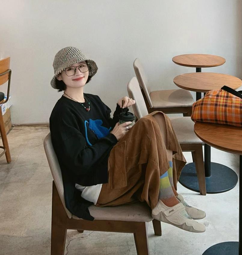 衛衣上面有很多小貓小狗,穿上就變成小可愛了,腳上白色襪子外露,輕鬆增加層次。