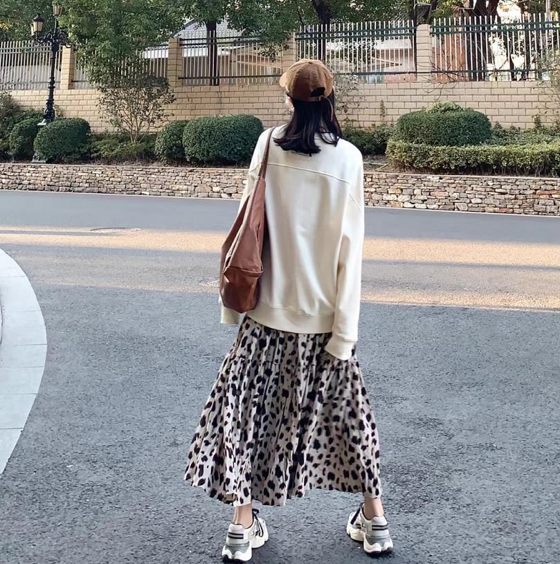 衛衣+豹紋半裙,上簡下繁的組合,也太顯層次了,十分好看的穿搭,垂墜感十足的裙身,拉長下身比例不是問題。