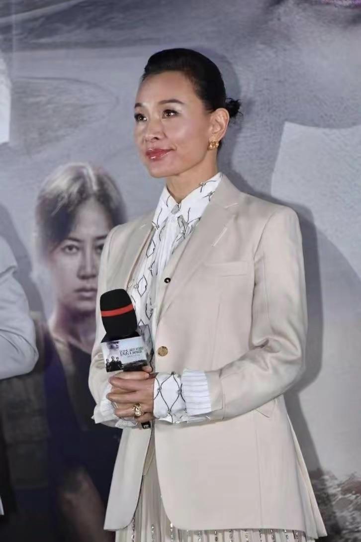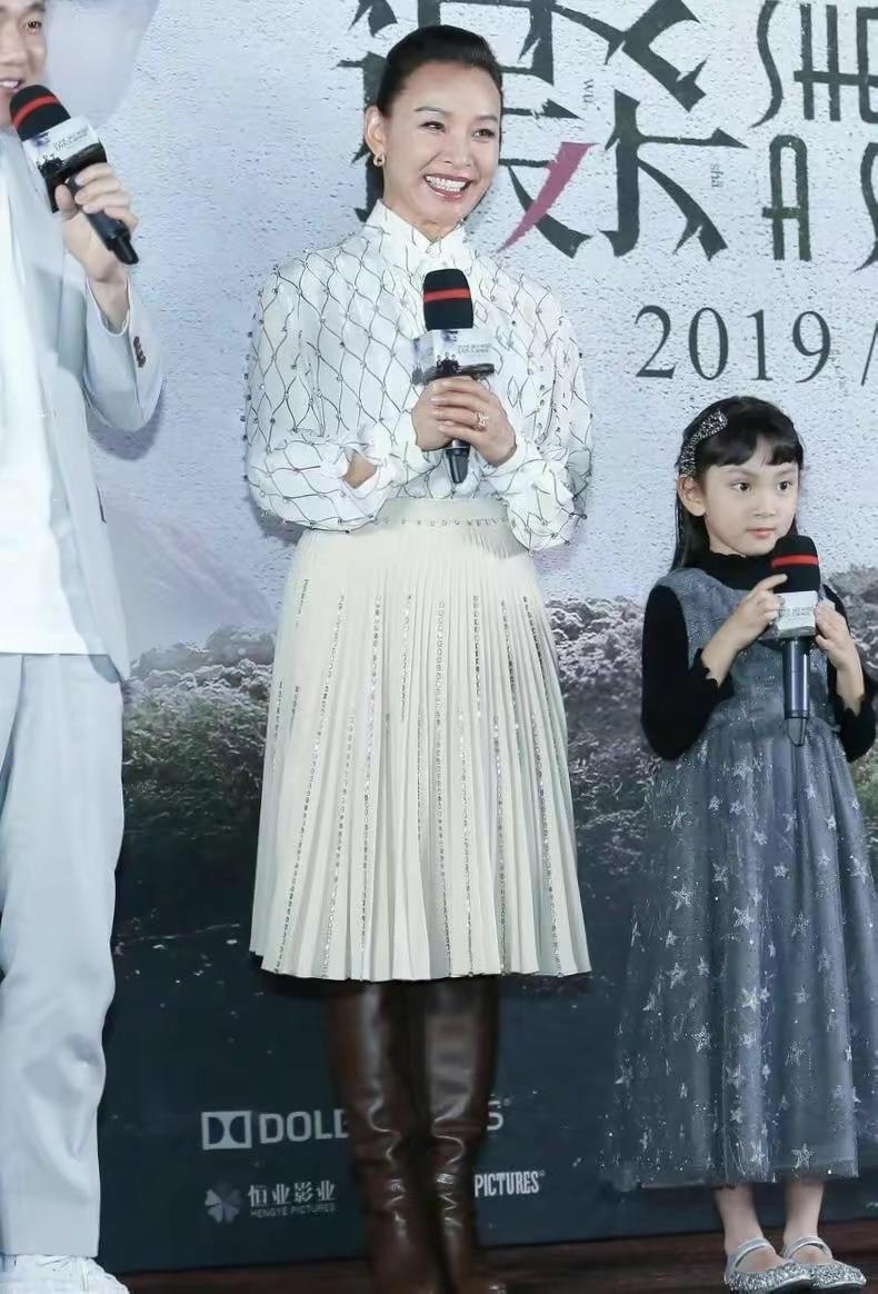 陳沖的白襯衫,選擇了比較經典的搭配方式。白色網格襯衫、配米白色的高腰百褶裙,順色的搭配有一種溫婉又體面的美,把女性的幹練、大方、浪漫、溫柔都自然呈現。