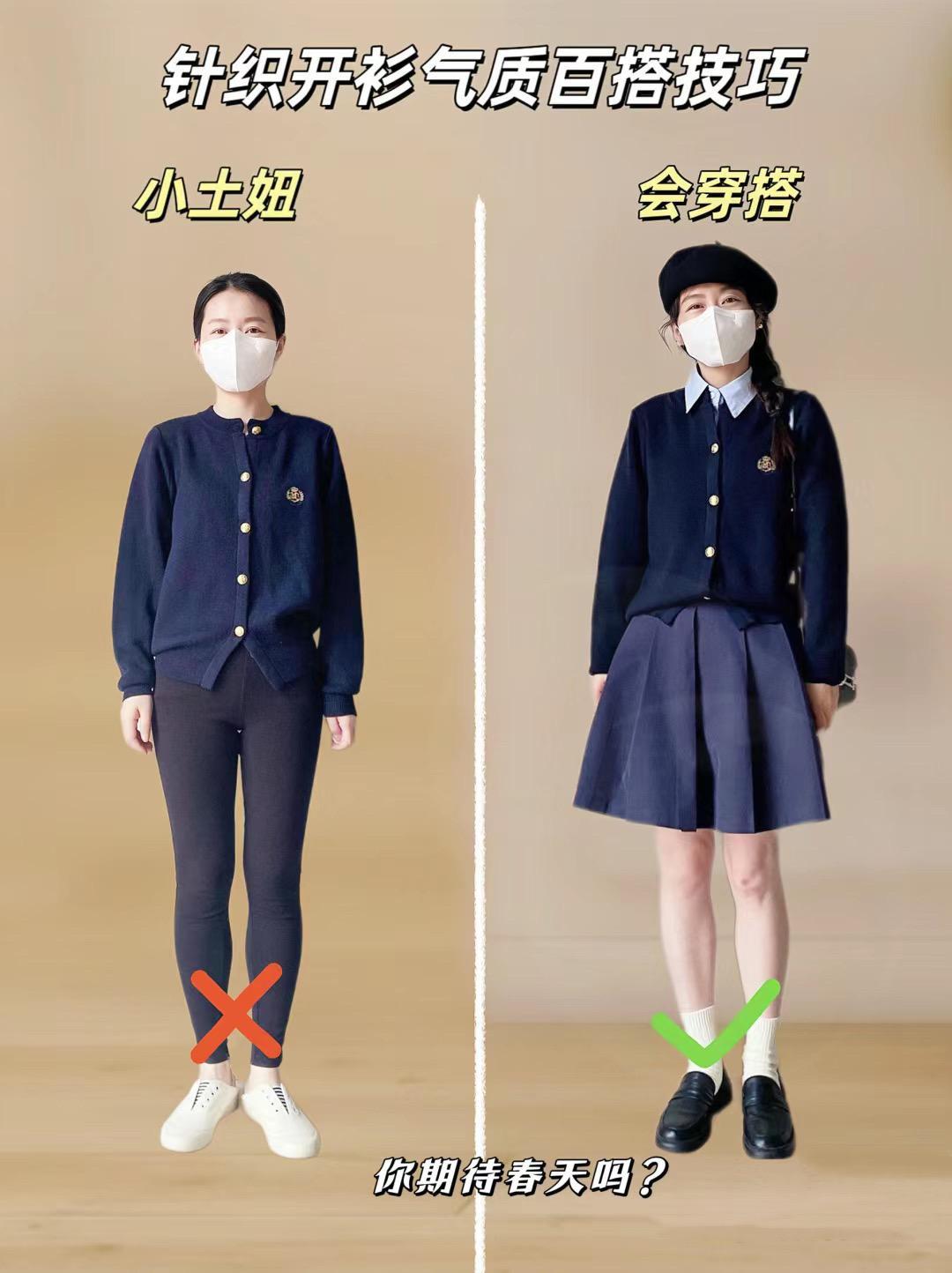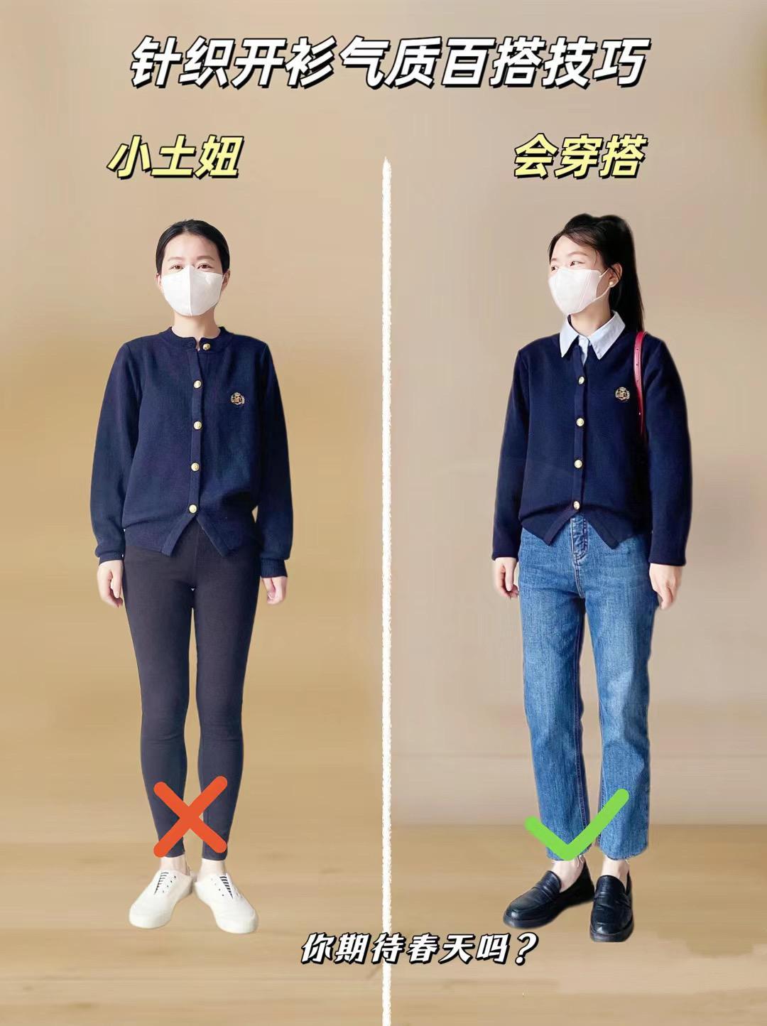 告別小土妞一般的造型,最簡單的就是學會穿衣搭配中的揚長避短。藏藍色針織開衫,可以塑造文藝風、也可以get學院風。
