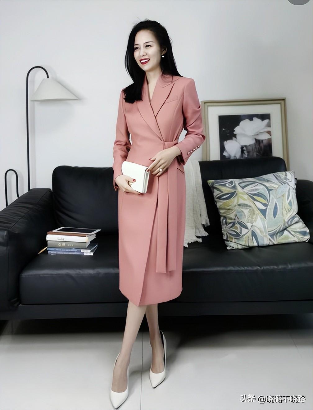 西裝裙雖然線條上平整,但是想要有獨特感要注重衣服的裁剪效果,裙襬加入不規則的設計,增添了衣服的時髦度。西裝裙是上下連體的設計,要注意腰身的劃分,自帶綁帶或者是收腰設計,不用擔心壓個子的問題。