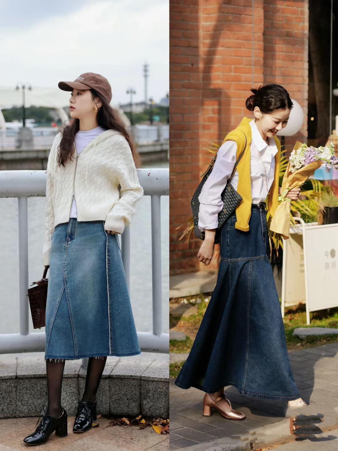 早春季節,乍暖還寒、保暖系穿搭也更加受歡迎。相對於輕盈飄逸的半身裙,牛仔半身裙具備了更強的防風保暖性。