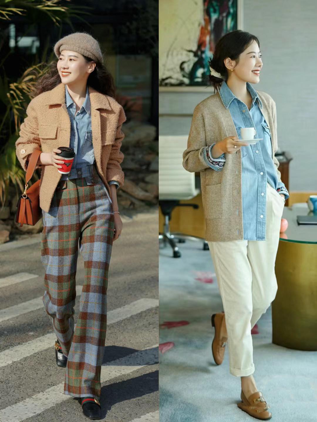 牛仔襯衫+駝色單品的組合,給人一種柔和高級的美。駝色針織衫、或者駝色小外套,都可以搭配牛仔襯衫來穿着。做舊的牛仔襯衫,醒目的藍色系也更加耐看。