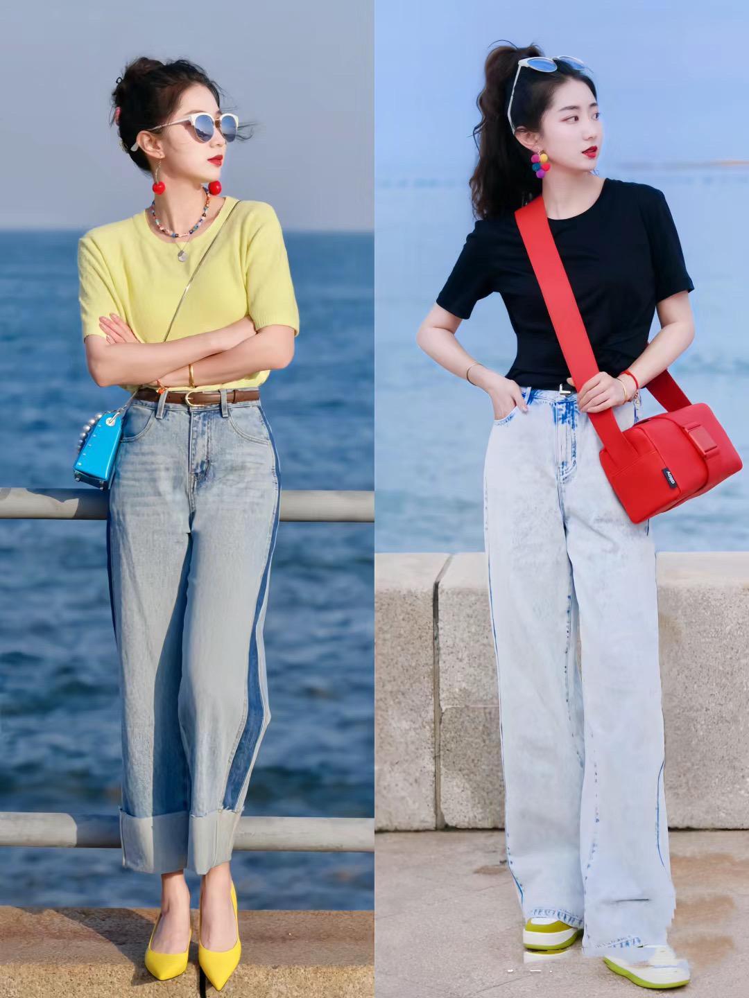 立體的藍色刺繡,與藍色高腰牛仔褲呼應起來,整體風格感更加協調。像這種刺繡襯衫,比較輕薄的面料,帶着春日氛圍。搭配高腰的藍色牛仔褲,又酷又美。