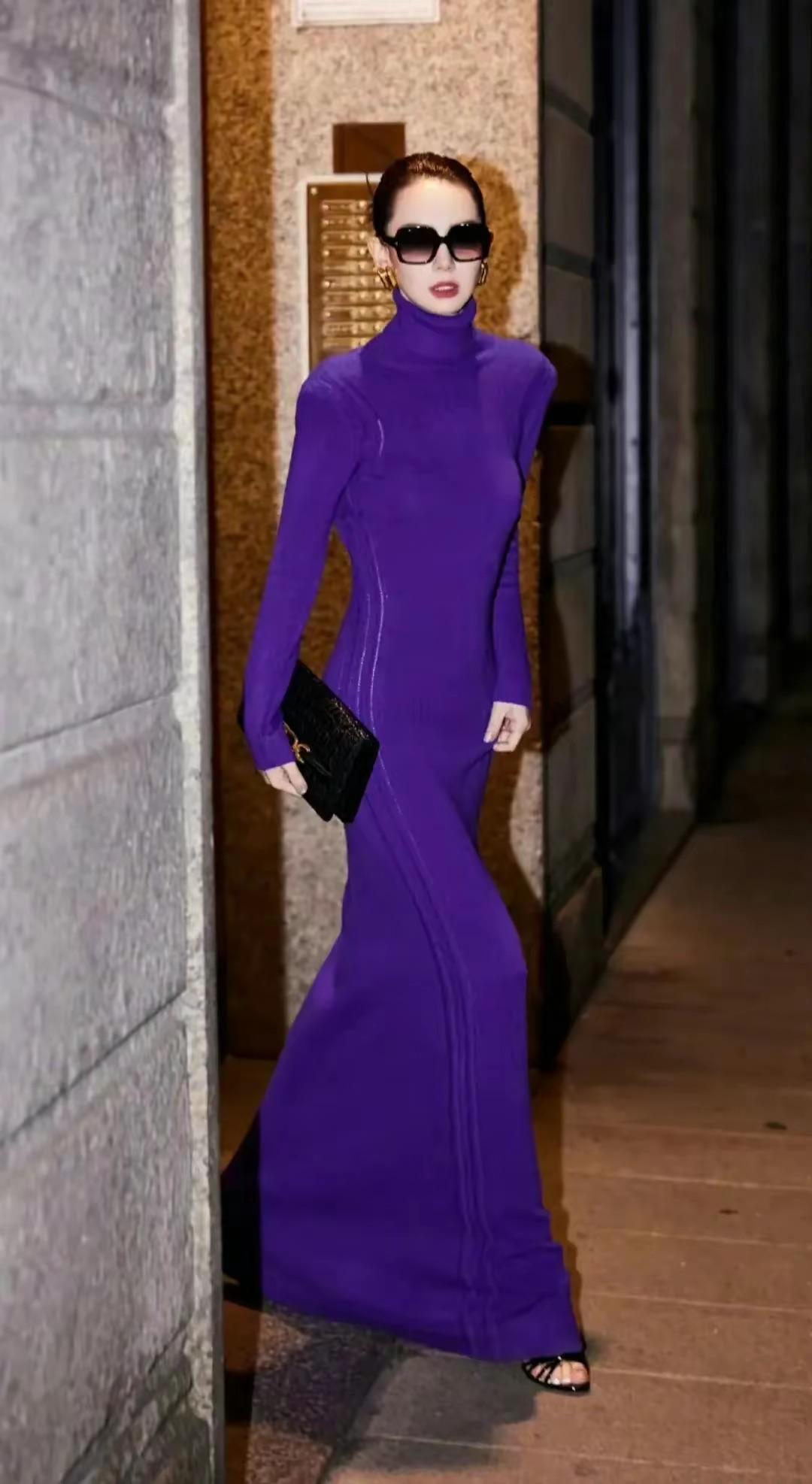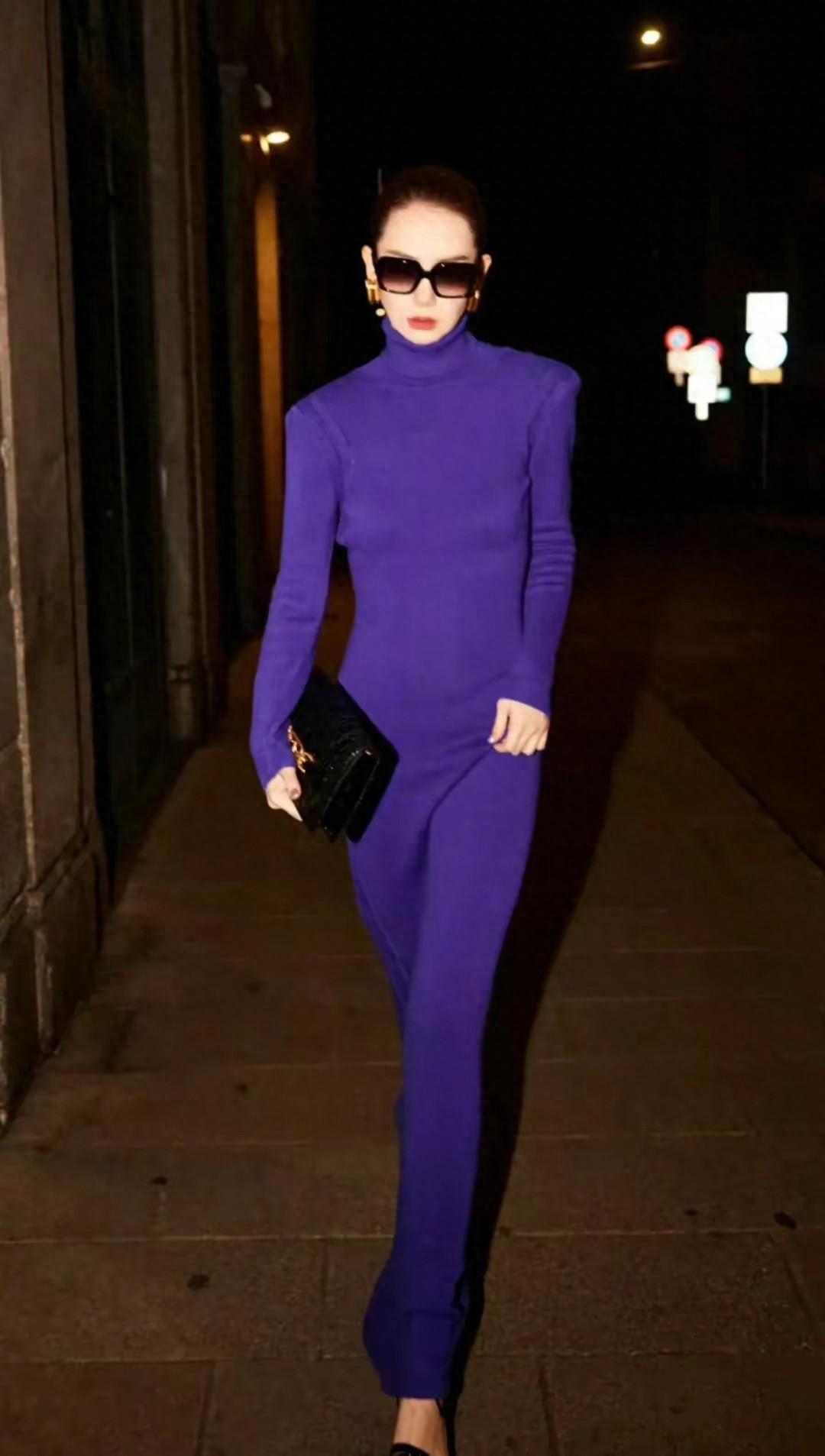 戚薇的這組造型,選擇了大面積的深紫色系。修身的深紫色長裙,色彩飽和度和亮度都比較高。這種自帶貴氣感、又很有辨識度的顏色,讓戚薇的穿搭更容易美出圈。