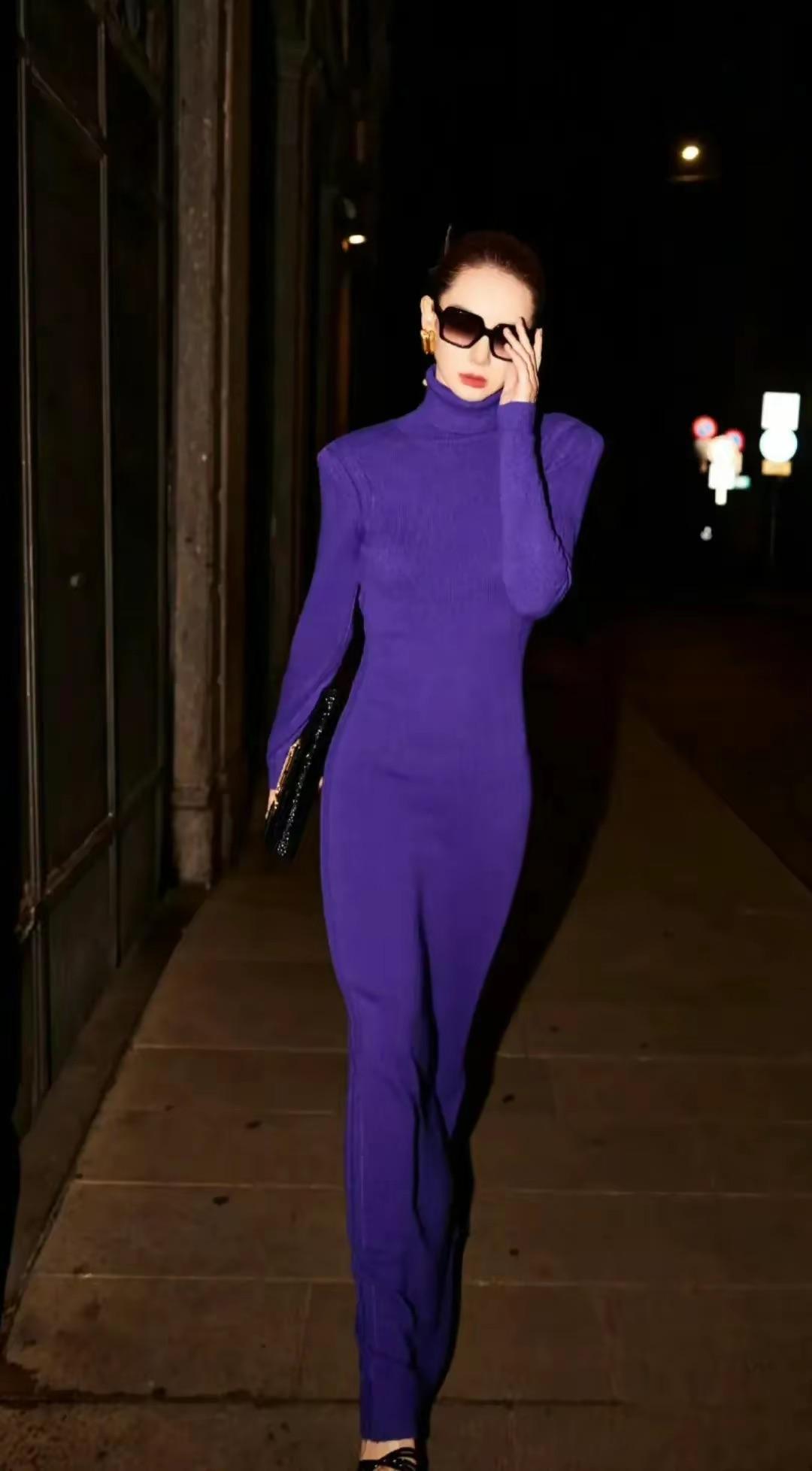 戚薇雖然生過娃,但是身材保持的非常好。這種緊身的無痕裙穿在她身上,一點壓力都沒有。直角肩、小蠻腰、大長腿,都更加自然的勾勒出來,深紫色的搭配也時髦醒目。