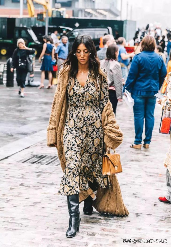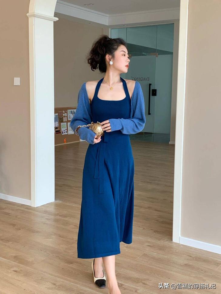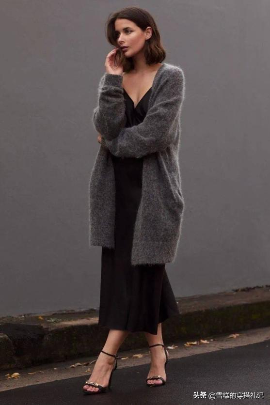 針織開衫的長度同樣需要注意,極致的短好過極致的長。長度剛好控制在胸部以下的位置,搭配高腰的連衣過膝裙,顯高顯瘦。拜拜袖的身材問題,蝙蝠袖的設計可以很好修飾。