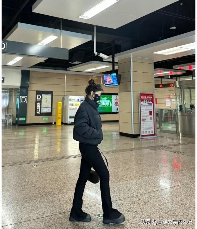 褲子的本身輪廓偏大,那麼這就意味着我們需要更多的去依靠上半身的修身線條,穿搭厚底鞋來做好腿型的縱向延伸,褲子的輪廓稍微遮一點腳面,上衣穿的緊身一點,這就是恰好的線條輪廓對比感。