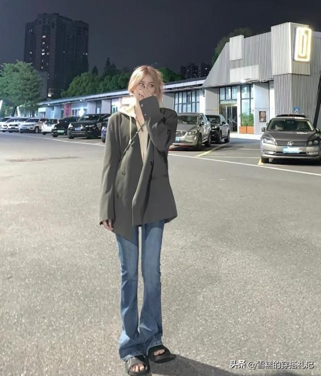 優化造型的精緻看點,馬蹄褲也可以呈現出一些造型的個性之處,比如穿搭厚底鞋,可能會有些中規中矩,那麼如果是露腳趾款式的鞋子,穿加長款式的馬蹄褲反而有一種視覺差異性,造型更加豐滿立體。